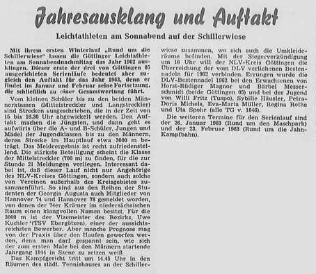 Am Nachmittag des 15. Dezembers 1962 - einem Samstag - ertönte auf der Schillerwiese der Startschuss zur ersten dreiteiligen Crosslaufserie, die von Göttingen 05 ins Leben gerufen wurde. Über die Teilnehmerzahl ist nichts bekannt, es dürften aber um die 50 Starter gewesen sein. Erster Sieger über die Langstrecke (ca. 3.000m) war Uwe Kuchler vom TSV Ebergötzen. Die Mittelstrecke über ca. 700m gewann der Hannoveraner Aurich (Hannover 78). Frauen waren noch nicht am Start.