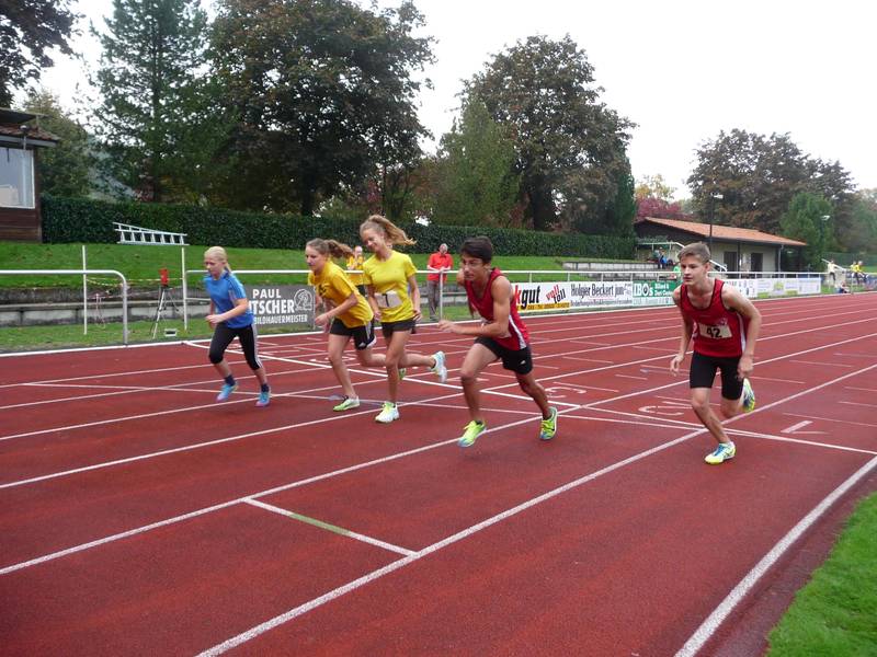 20140920 Osterode dsmm 800m start 800x60020140920 Osterode dsmm 800m 1 600x800Die äusseren Bedingungen waren gut, nur beim Ballwurf (für alle mit 200g- Ball) und Hochsprung war es noch etwas rutschig. Nuri Moschner konnte trotzdem mit 1,36m fast eine neue Bestleistung erzielen, die bei 1,37m liegt. Die Versuche über 1,40m waren nur denkbar knapp gerissen. Und Tobias Buck-Gramcko konnte mit 52,00m überzeugen, Jarik Strelow kratzte mit 39,50m an der 40m-Marke. Fenja Jende steuerte für das Team der Gruppe 2 noch 30,00m bei. Die jüngste im Team der Gruppe 3, die 11-Jährige Fabienne Jöst schaffte 22,50, dicht gefolgt von Finja Sichtmann mit 19,00m. Die 4-Meter-Grenze im Weitsprung wurde ein paar Mal knapp verfehlt, aber alle Teams konnten jeweils mit zwei Versuchen jenseits der 3m punkten.
