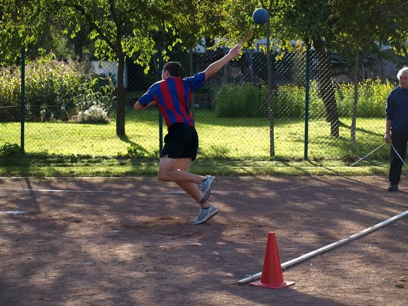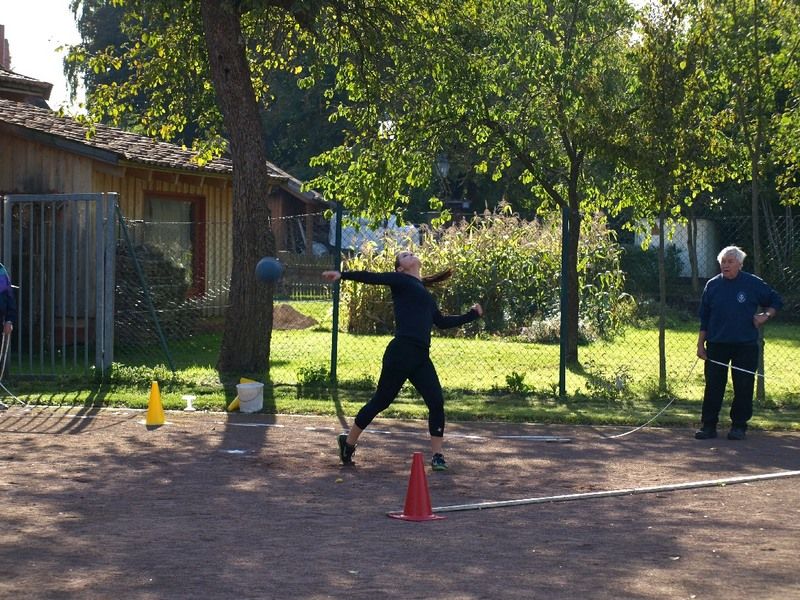 20131003 ebergoetzen elena 800x600Der eigentlich zum Turnen zählende Schleuderballwurf bot wieder äußerst dynamische Bewegungsabläufe. Die größte Weite des Tages gelang Lukas. Er schleuderte den 1,5kg-Ball aus einer Drehung 50,01m weit. Elena hatte mit koordinativ hoch anspruchsvollen zwei Drehungen, allen Würfen über 40m und der Siegleistung von 44,02m die Bewunderer auf ihrer Seite. Den ersten Kontakt mit dem Ball an der Schlaufe hatten die Koch-Brüder und Wolfgang. Julius schaffte mit einer Drehung passable 46,40m (1.), Wolfgang 37,95m, Martin aus dem Stand nur mit Armschwüngen 35,42m. Merle wollte eigentlich die 40m-Marke knacken und war daher mit ihren 39,55m nicht ganz zufrieden. Dennoch war sie hier ebenso unangefochten in Front wie beim vorangegangenen Speerwurf, wo sie mit 33,30m persönliche Bestleistung erzielte. Da der Speerwurfanlauf auf Gras stattfand, sind auch Wolfgangs 39,62m durchaus bemerkenswert.